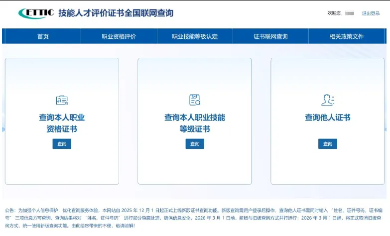 为保障个人信息安全,2025年 12月1日本网站新版证书查询功能上线。新版证书查询方式说明如下:
