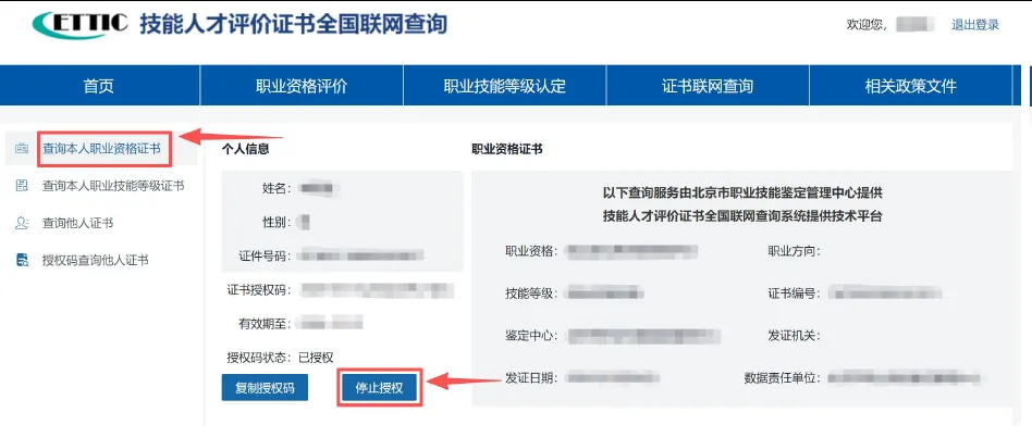 3、个人用户可通过授权码方式,分别授权他人查询本人名下职业资格证书或职业技能等级证书,查询结果显示证书的完整信息。授权码有效期一年,可随时登录账户终止授权。