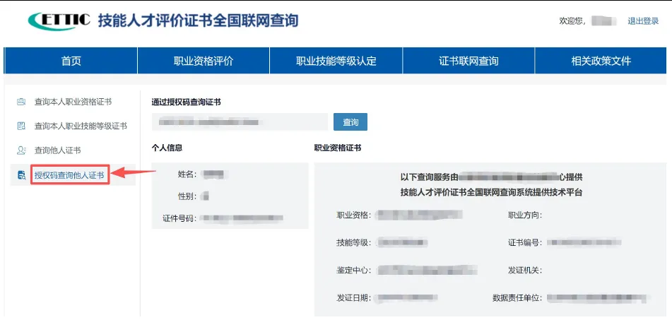 路径:左侧菜单栏→【授权码查询他人证书】