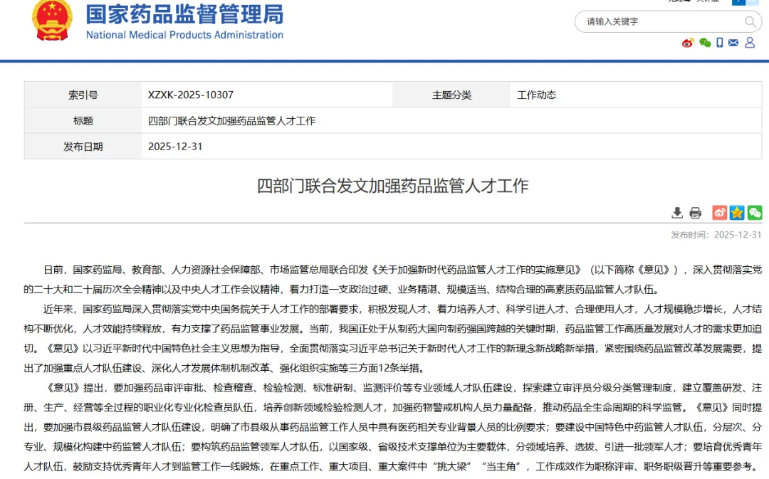 日前,国家药监局、教育部、人力资源社会保障部、市场监管总局联合印发《关于加强新时代药品监管人才工作的实施意见》(以下简称《意见》),深入贯彻落实党的二十大和二十届历次全会精神以及中央人才工作会议精神,着力打造一支政治过硬、业务精湛、规模适当、结构合理的高素质药品监管人才队伍。