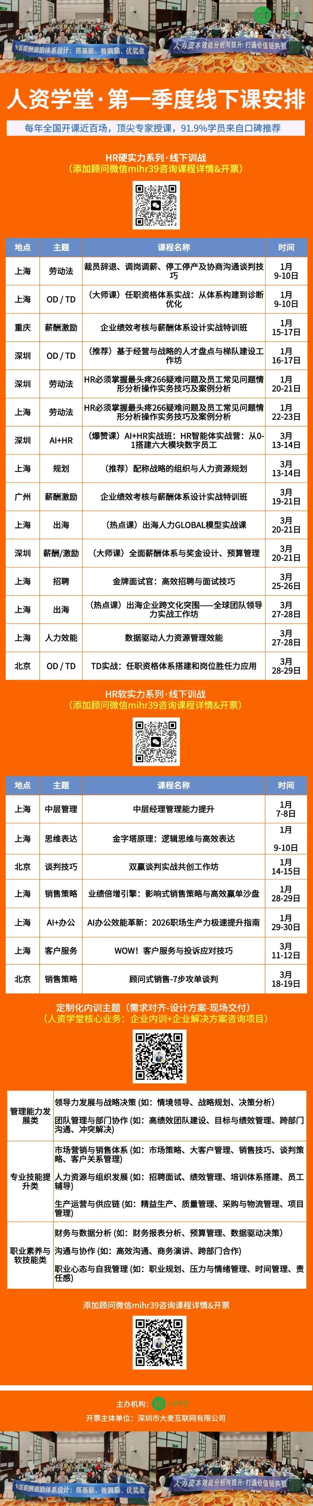 主办单位:人资学堂,深圳市大麦互联网有限公司旗下企业管理咨询品牌,成立于2013年,总部位于深圳,每年开课场次超过100场,超5000家企业参与学习,大量的学员来自口碑推荐。报名信息:提前一周报名早鸟价,企业3人团报优惠,发票&培训协议可联系顾问