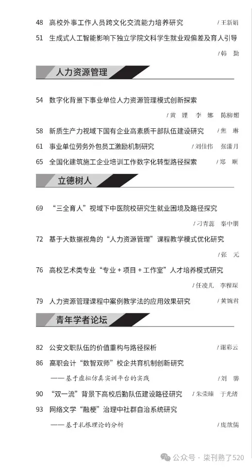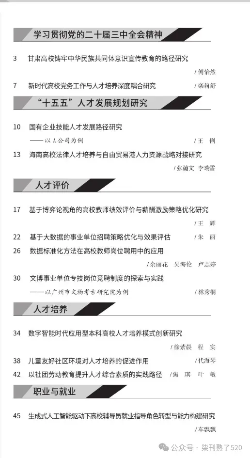 《人才资源开发》省级知网,征集:教育科技人才一体化发展、世界重要人才中心和创新高地建设、"十五五"人才发展规划、人才基本理论、公共组织与人才管理、人事人才制度改革、人才评价、人才培养、职业与就业、人力资源管理、青年学者论坛等。3版4500字符,25年10月刊期,26年4月出刊。