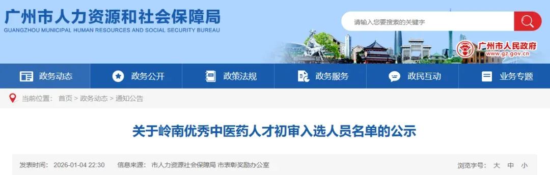 点击上方↑"海外英才荟"快速关注我们 根据《广东省人力资源和社会保障厅 广东省卫生健康委 广东省中医药局关于评选表彰岭南优秀中医药人才的通知》(粤人社函〔2025〕284号)有关要求,经省评选工作领导小组办公室组织专家对候选人进行初审,我市推荐的王成银等17人(见附件)纳入初审通过人选。现将初审人选名单予以公示,公示期为5个工作日(2026年1月4日至1月8日)。