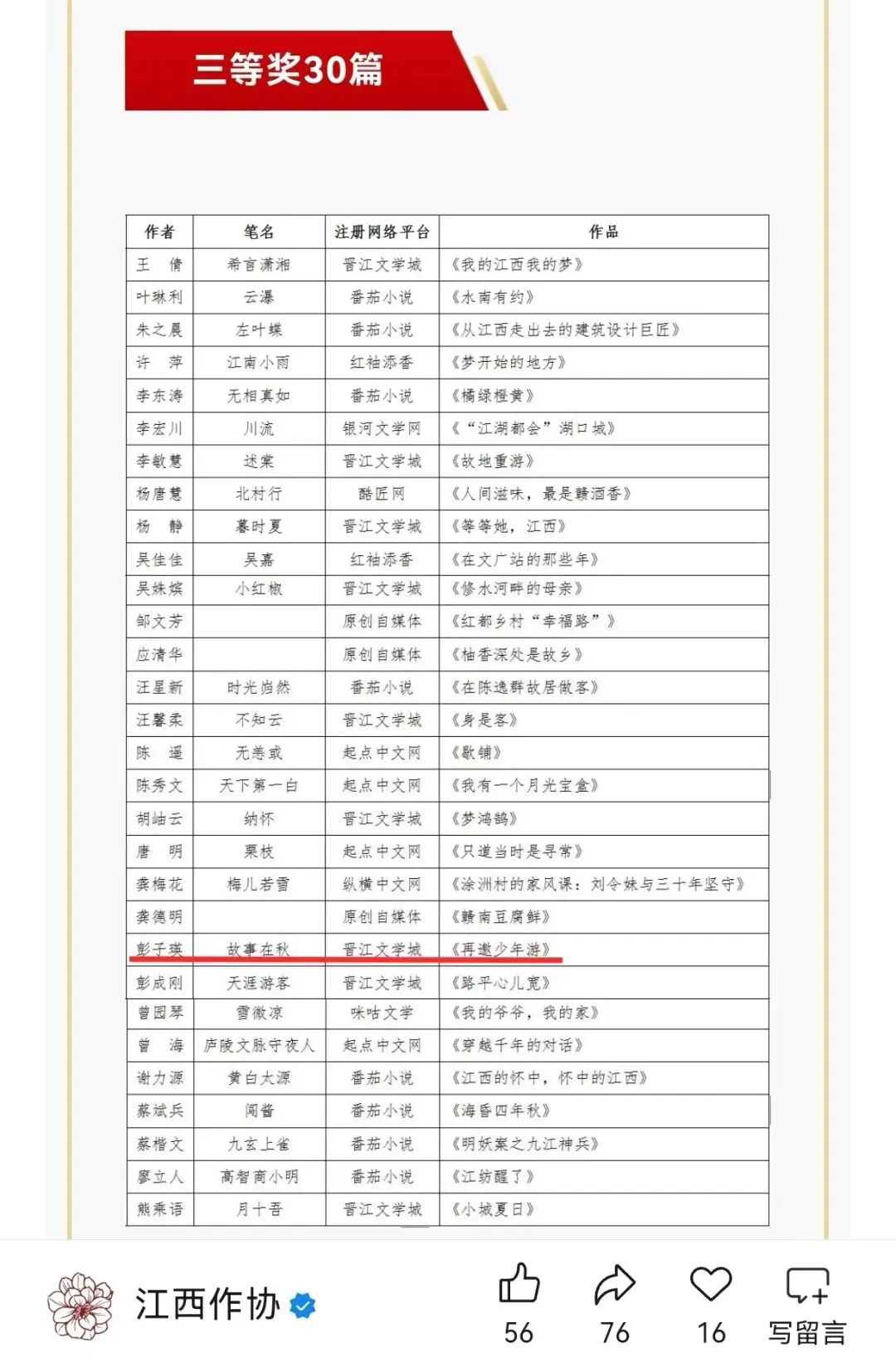 彭子瑛(故事在秋)《再遨少年游》获“我的江西我的梦”江西网络作家写江西文学大赛三等奖
