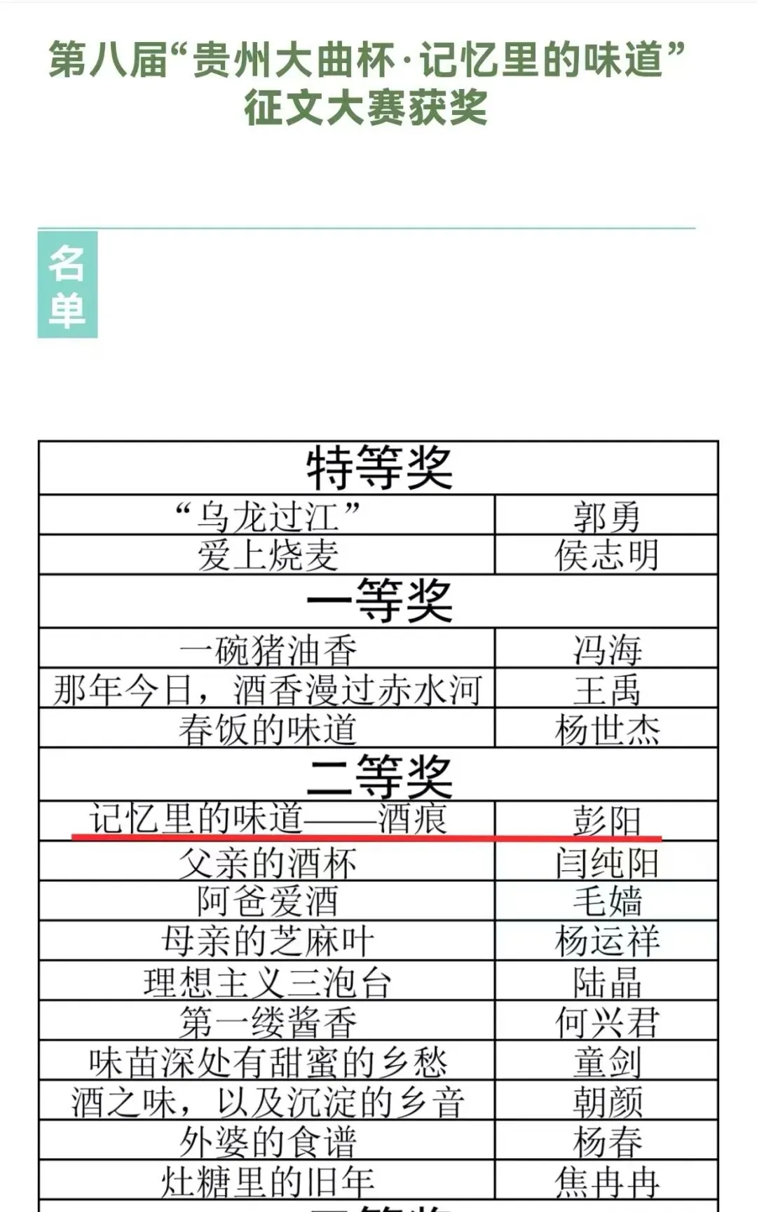 彭阳《记忆里的味道——酒痕》获第八届“贵州大曲杯·记忆里的味道”全国征文大赛二等奖