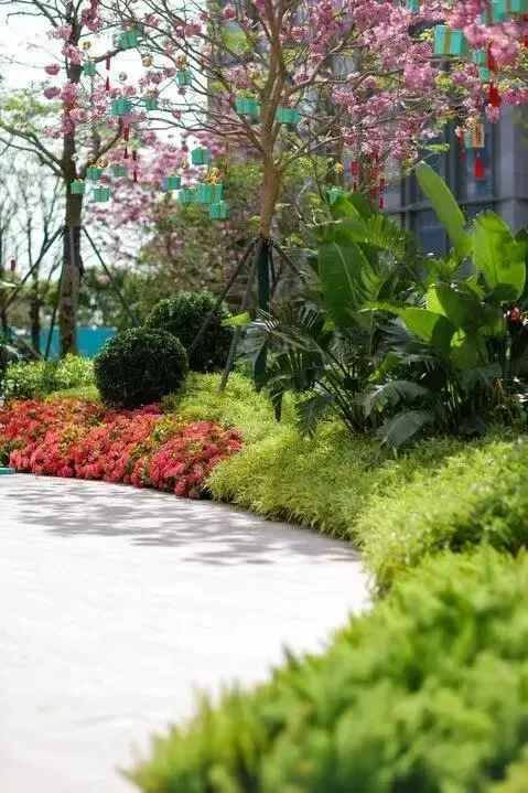 项目整体园林景观以一园四景为设计框架,充分利用运动公园和四大景观主题将各地块串联起来,围绕自然、乐园、生活构建生态和谐的景观结构。其中包括名贵树种,造型罗汉松、造型日本冬青、绣球紫花风铃木等。