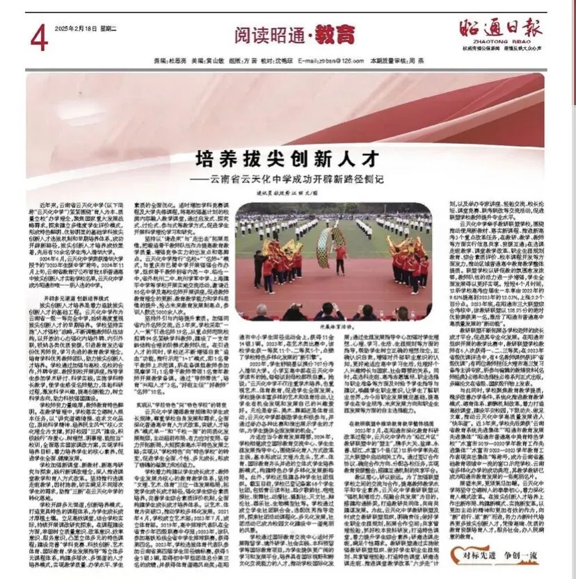 云天化中学遵循教育规律和学生成长规律,尊重学校自身发展和需求,全面深化普通高中育人方式改革,突破人才培养“模式单一”和“千校一面”的同质化发展瓶颈,主动超前布局、有力应对变局、奋力开拓新局,大胆探索高水平特色发展之路;实现从“学校特色”向“特色学校”的转变,促进学生全面、个性、多元成长,形成了磅礴的凝聚力和创造力。
