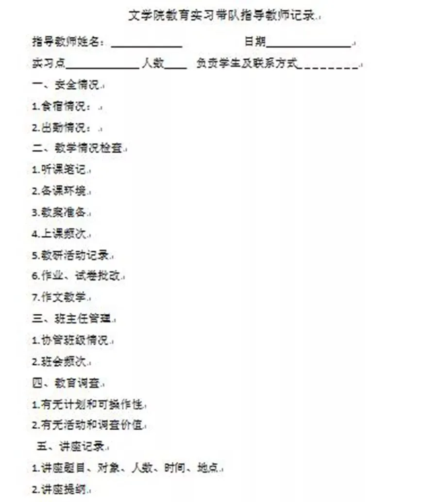 文学院教师对实习进行分块、系对系的过程化管理。总体上派遣老师带队指导,具体落实到各专业上,都有不同的管控方式。过程化管理中,依据《文学院汉语言文学专业2016级师范生教育实习带队教师轮流周次表》《各地实习情况统计》等文件,强调要有详细的实习指导计划及实习记录表。实习记录表主要包括实习地点、指导教师信息、指导周数、各实习地点的实习生人数等信息。