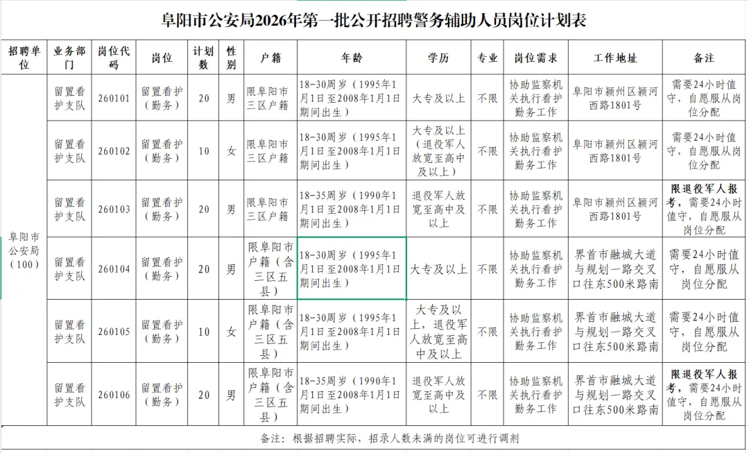 附件:阜阳市公安局2026年第一批公开招聘警务辅助人员岗位计划表