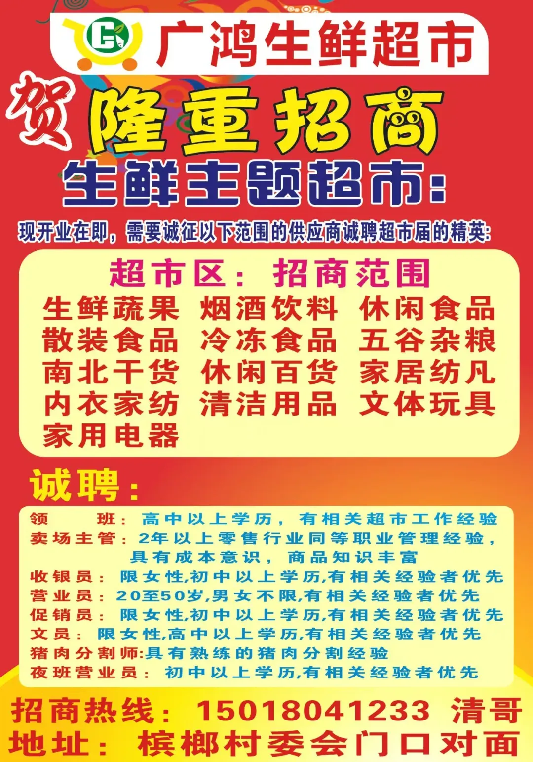 招聘岗位:店长、领班、文员、猪肉分割长、鸡鱼专卖员、生鲜员、理货员、收银员、促销员、生鲜钟点工