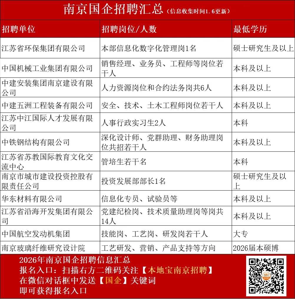 回复【国企央企】获取各国企央企江苏/南京分公司招聘信息