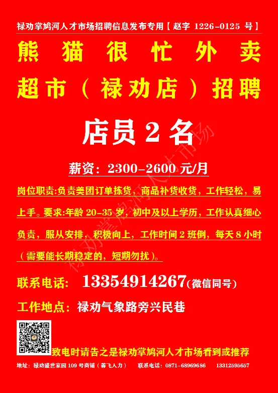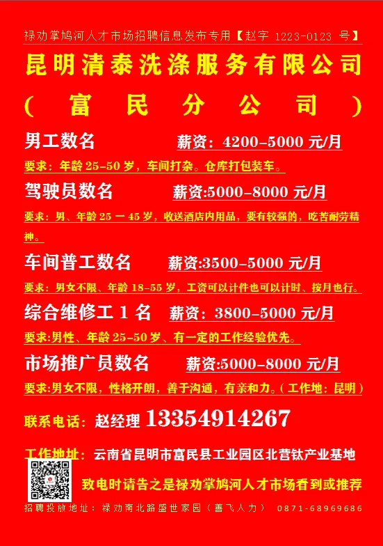 联系地址:禄劝滨河广场5栋4楼 致电时请告之是禄劝掌鸠河人才市场看到或推荐