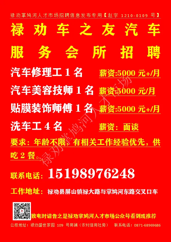 致电时请告之是禄劝掌鸠河人才市场公众号看到