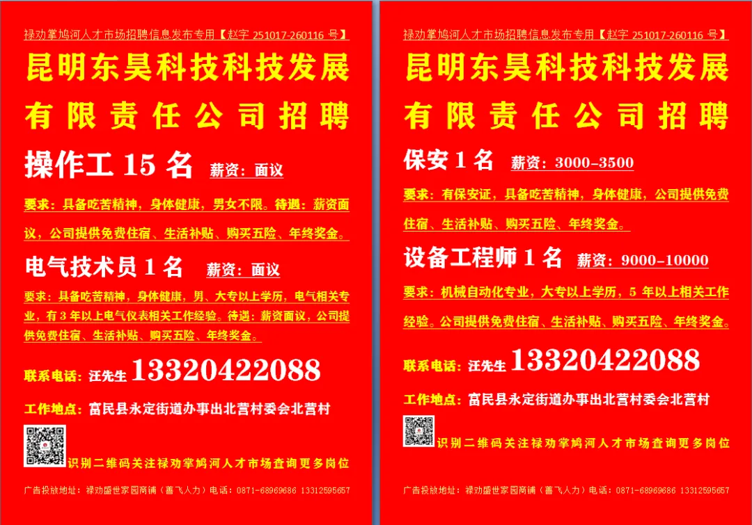 “善谋致远,飞擎未来——云南善飞,让人才与机遇精准相遇。” 投诉电话:0871-68969686 13312595657禄劝掌鸠河人才市场郑重承诺,所有岗位均提供营业执照招聘,岗位真实有效,在面试时问清楚工资及福利,再做臻选。为更好的为大家服务,部份岗位电话号码为禄劝掌鸠河人才市场工作人员电话,请放心面试。