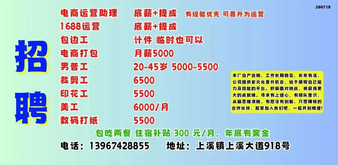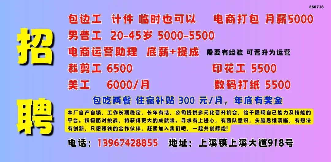 本厂自产自销,工作长期稳定,长年有活,公司提供多元化晋升机会,给于展现自己能力及技能的平台。积极面对挑战,将获得更大的成就哦。寻求有上进心,有团队意识,头脑思维清晰,有想法有创新,只想赚钱的合作伙伴,赶紧加入我们吧,一起共创辉煌!