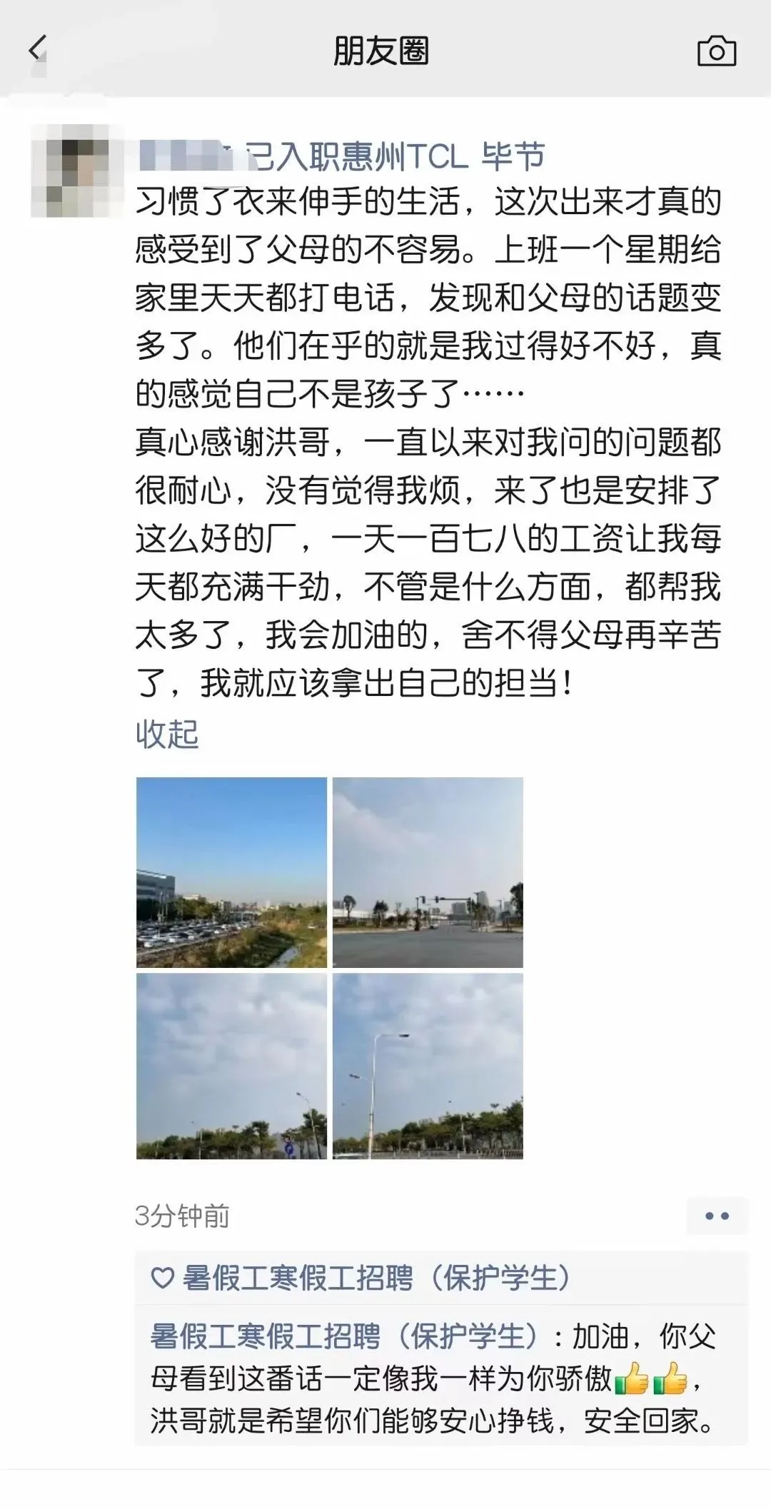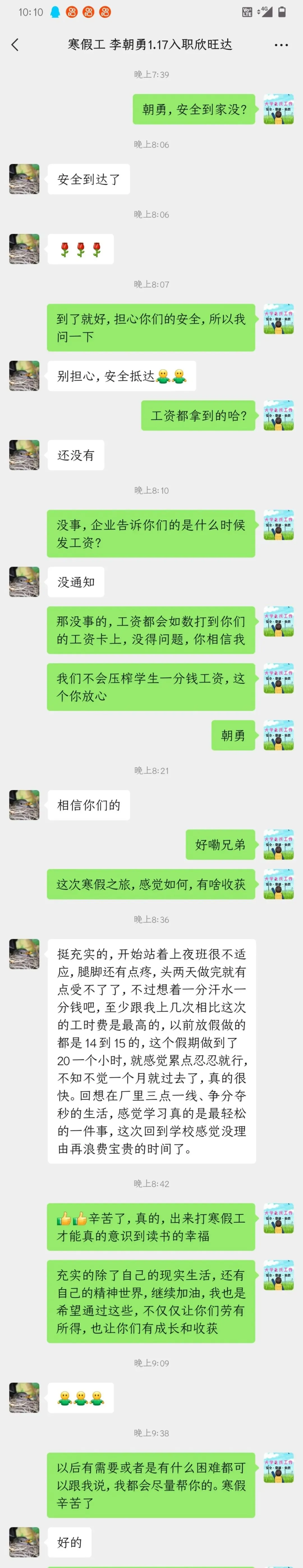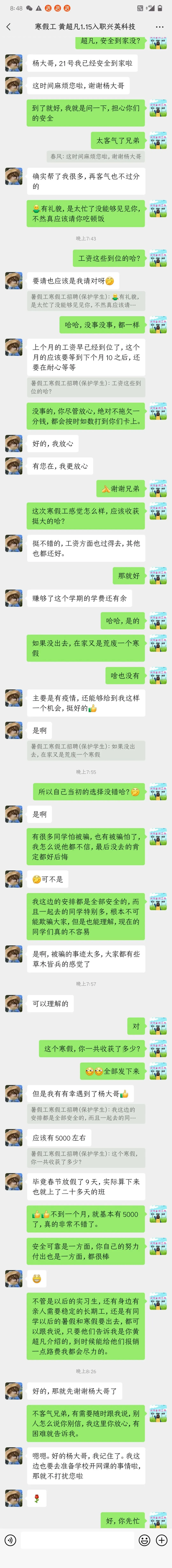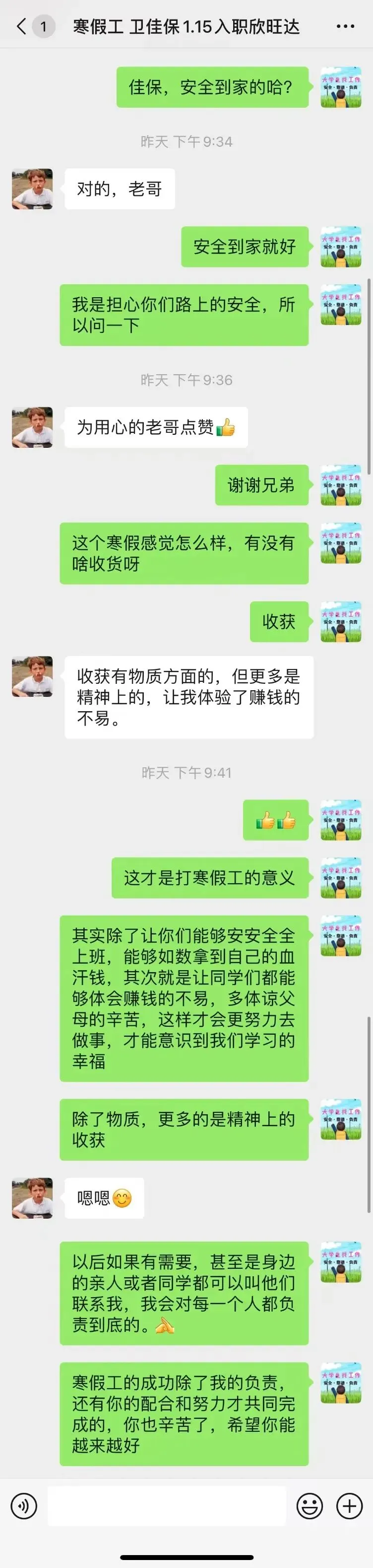 我不知道那些不听我劝去被骗了的同学怎么想,我想告诉大家,我们作为学生其实很不容易,处在这样尴尬的年纪,想挣钱但是没有好的门路,想无忧无虑又心疼父母的辛苦。或许你第一次接触你不敢信任我,又或许你是被骗怕了都没关系,我以后都在为同学们服务,如果你觉得我信得过,或者是我曾经帮助过你,那么请把我推荐给你身边需要的同学和朋友,这样也间接性的给他们提供了一个有力的保障。我说过让大家安安心心挣钱,安安全全回家这不是口号,今年我们十来万的寒假工同学没有任何一个人感染,没有任何一个人出危险,都全部拿到工资以后返回学校或者是回家!