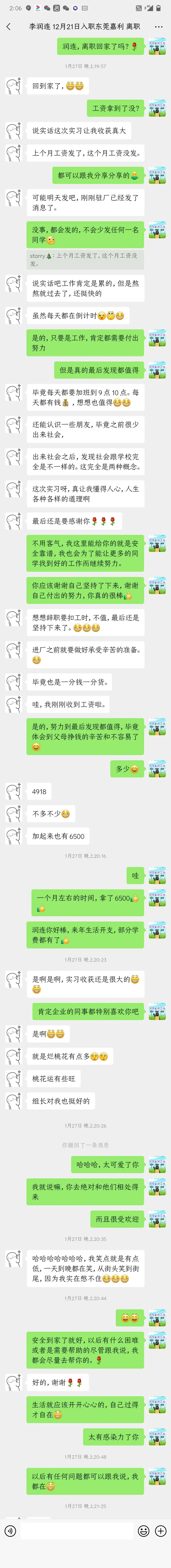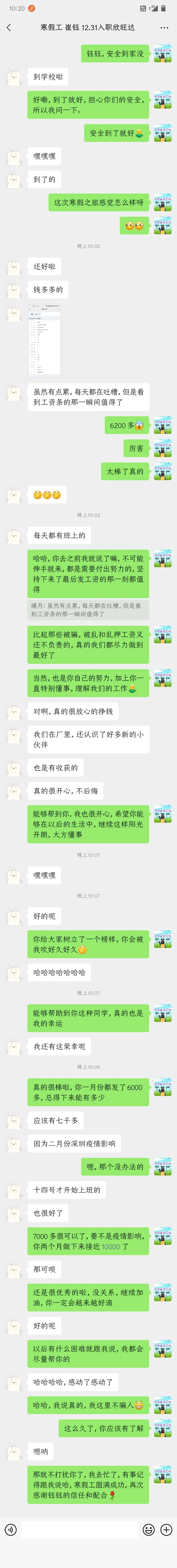 崔钰同学是我本年度寒假工招聘中遇到最有感染力的小伙伴了,她一个人从海南跨越山河大海跑到广东打寒假工,路上转了好多次车,然后又买机票。这么久的寒假工工作,没有跟我抱怨一个字,她告诉我虽然自己也吐槽过,但是最后工资到账了就一切都值得。就是她一直夸我们的驻厂负责,然后心疼我们工作的辛苦,真的是一个特别棒的女孩子,第一个月工资就高达6200,如果不是疫情耽误工作进度,最后可能至少能够拿到10000+的工资,我相信懂得感恩的人都不会差,她一直心疼我们的驻厂,一直都在夸我们负责,这也是我特别自豪的地方,感谢钰钰的信任和鼓励,我们一定会再接再厉。