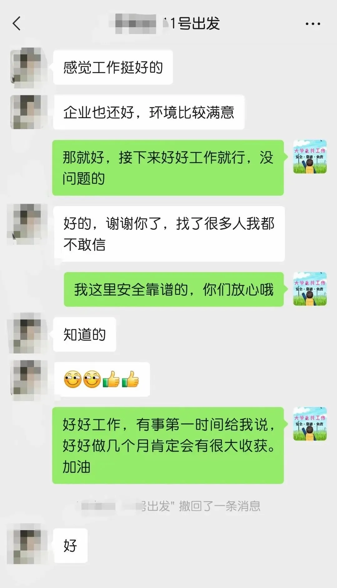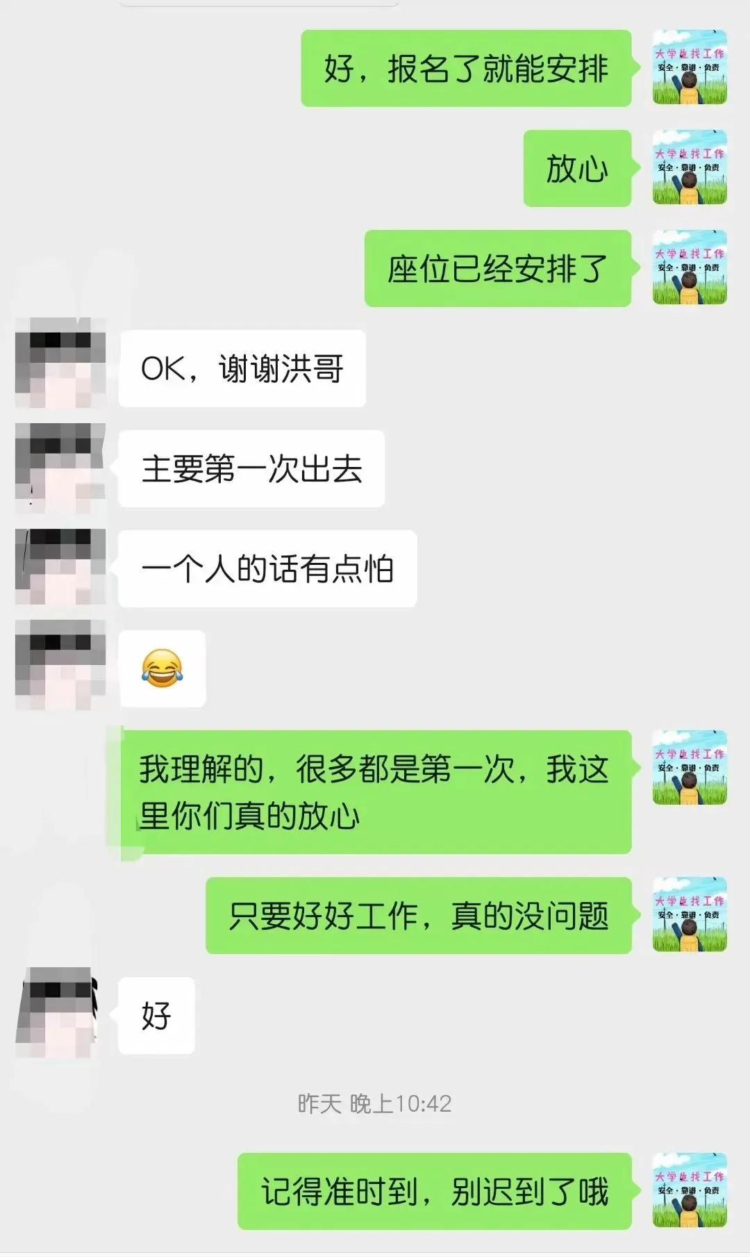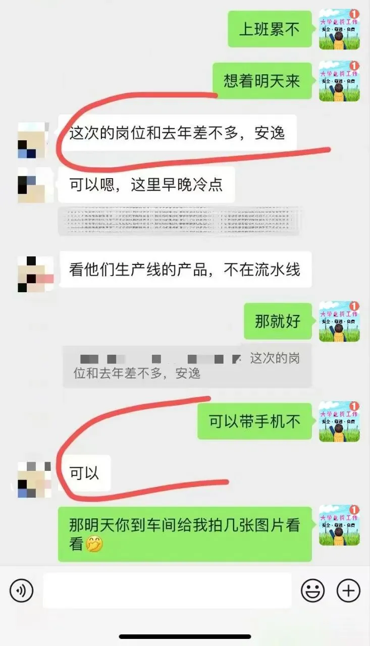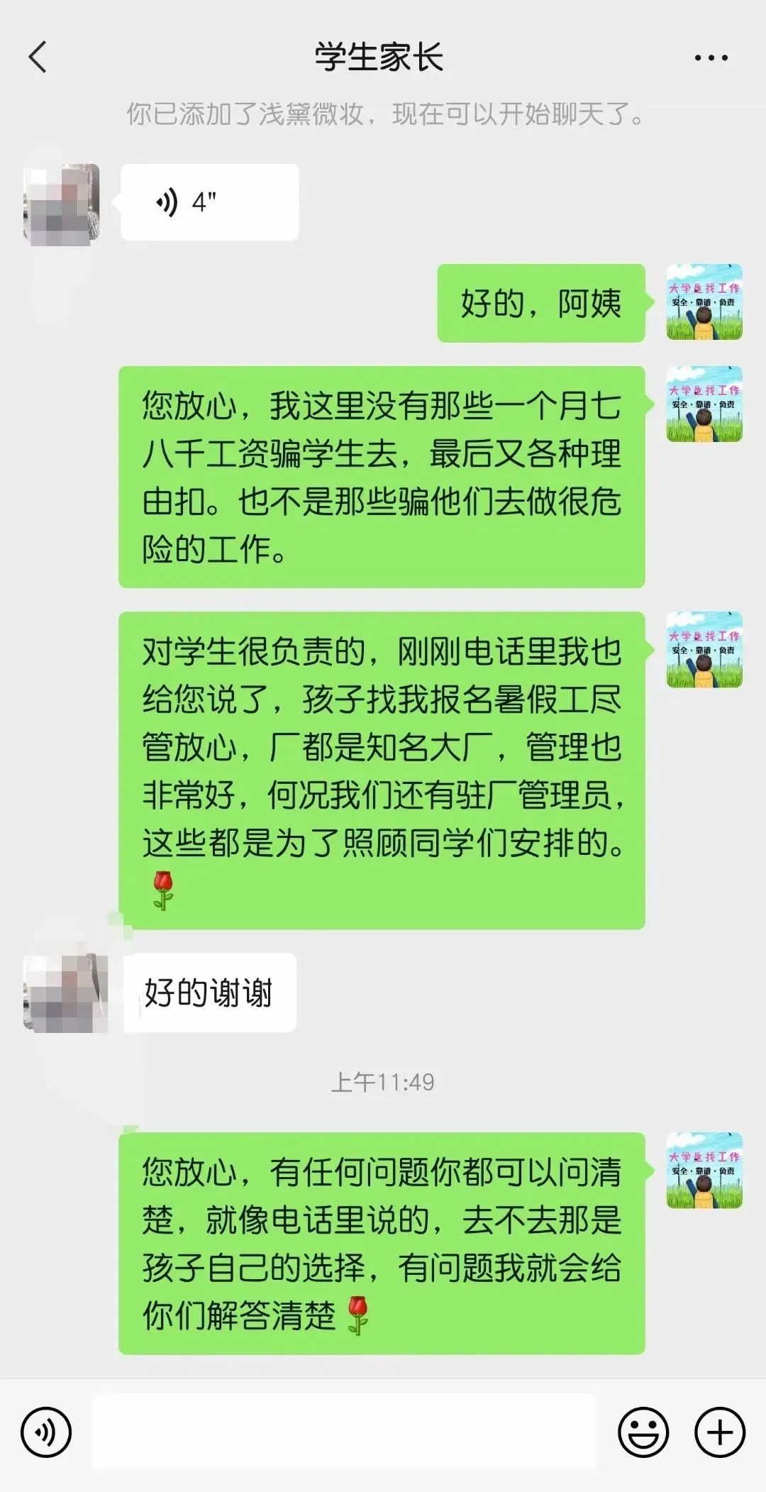 这里面有我和给一些同学安排入职的真实过程,还有和学生家长沟通,帮他们解决疑问等等,我想告诉同学们,找我我可以给你们保证绝对是你能找到最靠谱最安全的工作了,所以希望同学们能够尽快咨询报名,全国各地找我的学生都非常多,只要大家好好工作,我可以考虑给大家酌情报销一些车费,帮助更多的同学安安心心工作,平平安安回家,远离欺骗,不让家长担心。