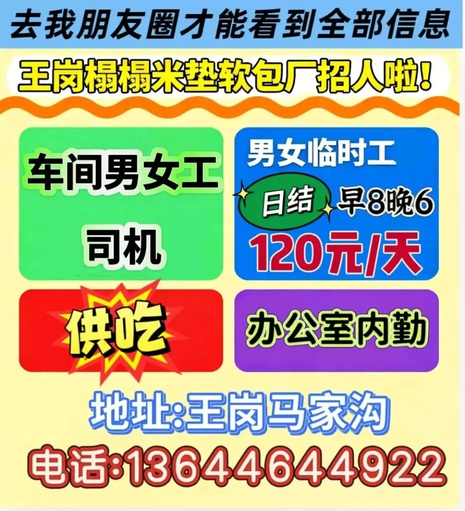 💙男女临时工(日结):120一天,早八晚六,中午管饭