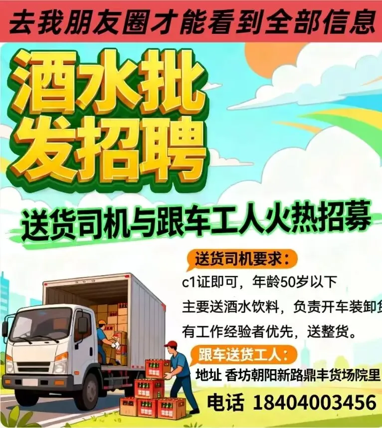 主要送酒水🍺饮料,负责开车装卸货,有工作经验者优先,送整货。