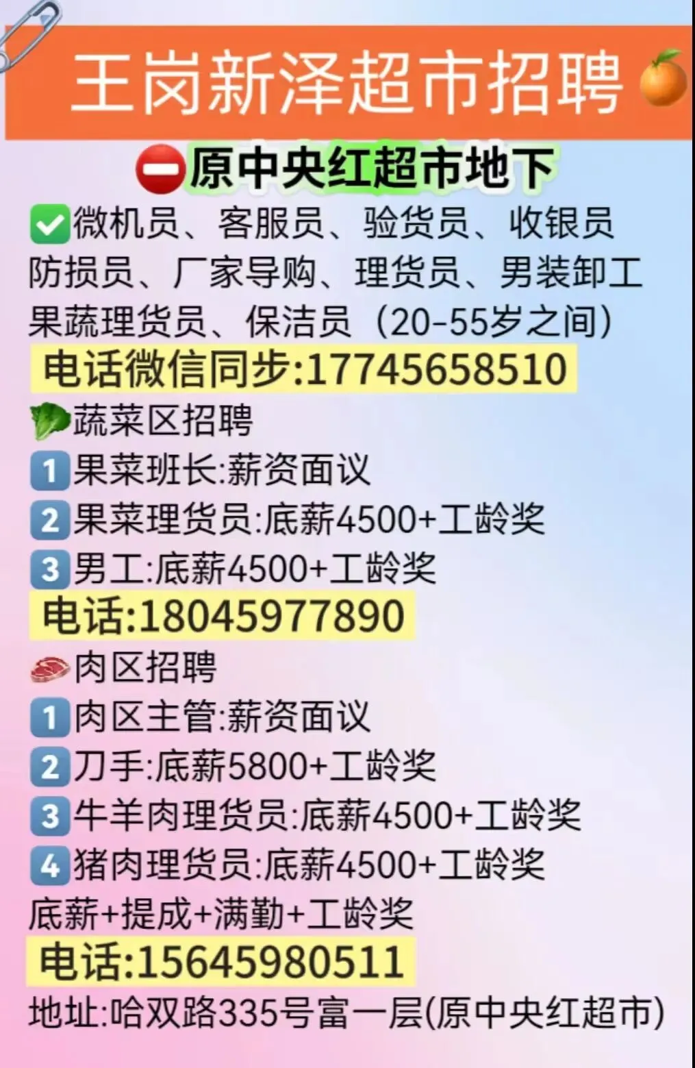 【王岗新泽超市招聘】⛔原中央红超市地下