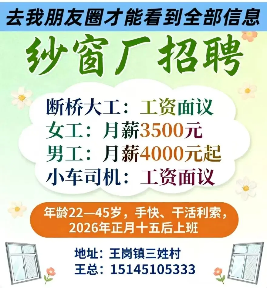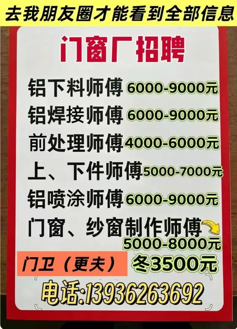 ★门窗、纱窗制作师傅3名 月薪5000-8000元 有门窗、纱窗工作经验者优先