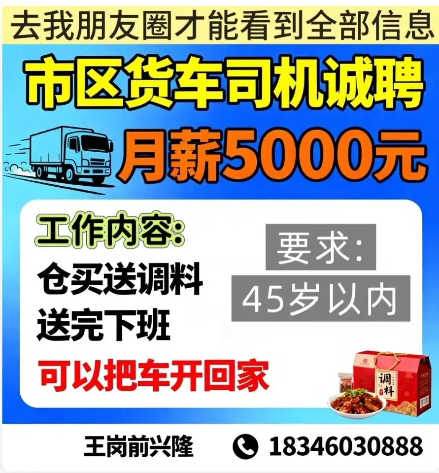 【市区货车司机】月薪5000元,仓买送调料,送完下班,要求45岁以下