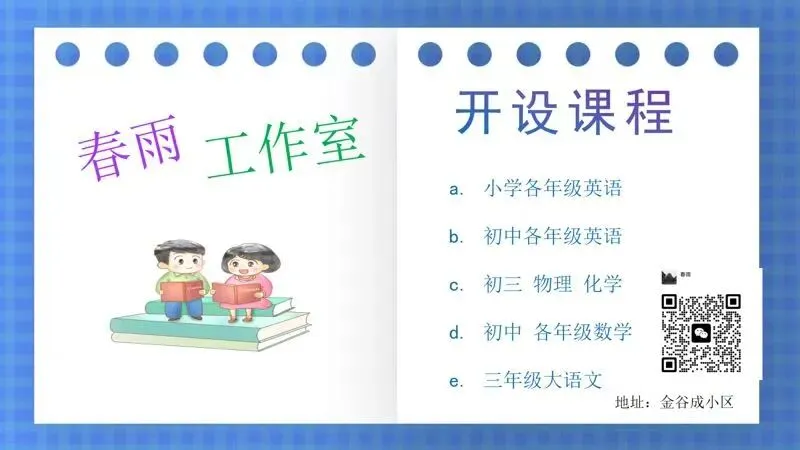 * **课程特色:**精品 小班授课,九年教龄经验丰富教师主讲,精准定位知识薄弱点,注重思维训练与方法传授,更注重激发孩子的潜能与培养孩子终身学习的能力。