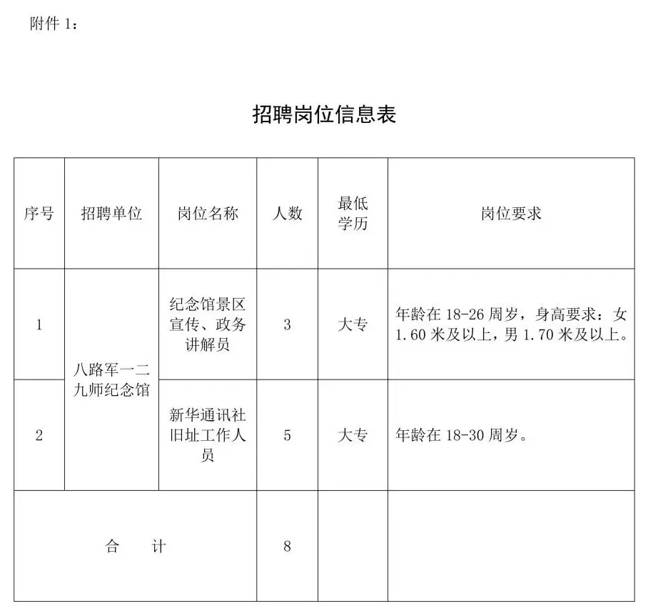 为了更好地发挥八路军一二九师纪念馆社会教育功能,提升讲解、宣传、文物保护管理水平,满足公共文化需求,现面向社会公开招聘景区宣传及政务讲解人员3名、西戌新华通讯社旧址工作人员5名。公告如下:
