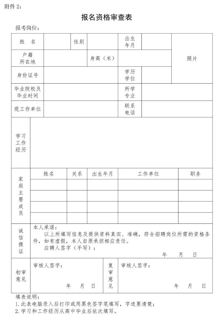 (1)自行下载填写《报名资格审查表》1份(见附件2),A4纸打印,要求本人填写完整、信息准确、6张近期1寸正面免冠彩色证件照片(背景颜色无要求);
