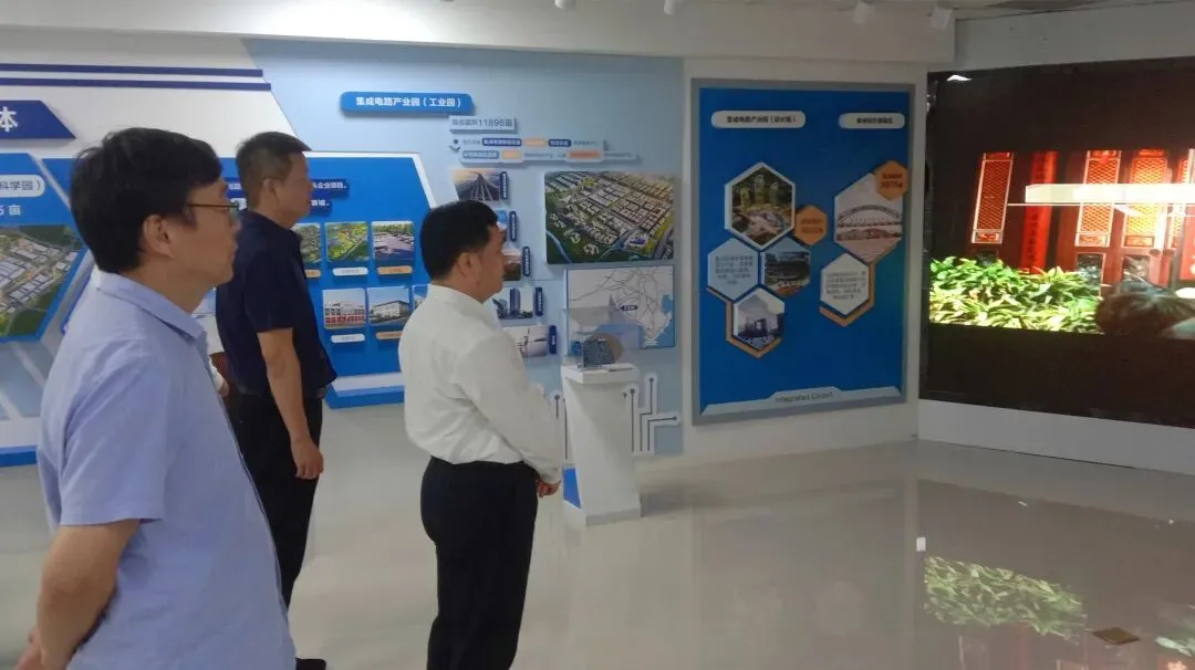 随后,考察组一行来到集成电路筹备组,参观集成电路产业展厅,详细了解产业发展情况,围绕人才培养、区校合作、产教融合等相关事宜开展交流。