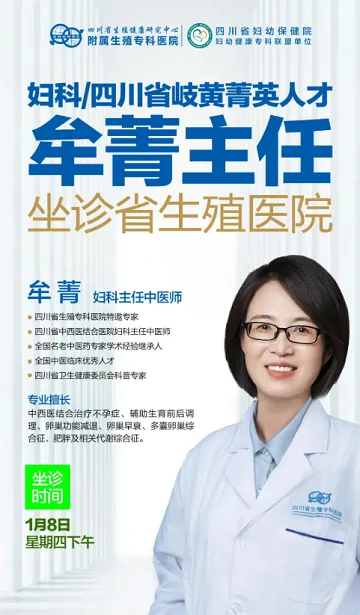 第六批全国中医临床优秀人才、第七批全国名老中医药专家继承人、四川省岐黄菁英人才、四川省中医药管理局学术技术带头人后备人选、四川省卫生健康委员会科普专家——牟菁主任医师,将于2026年1月8日起正式在我院开设专家门诊,为广大女性朋友提供权威诊疗服务!