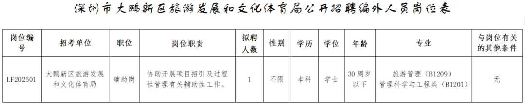 (1)《深圳市大鹏新区旅游发展和文化体育局公开招聘编外人员报名表》(详见附件2)扫描件,报名表需附上近期证件照;