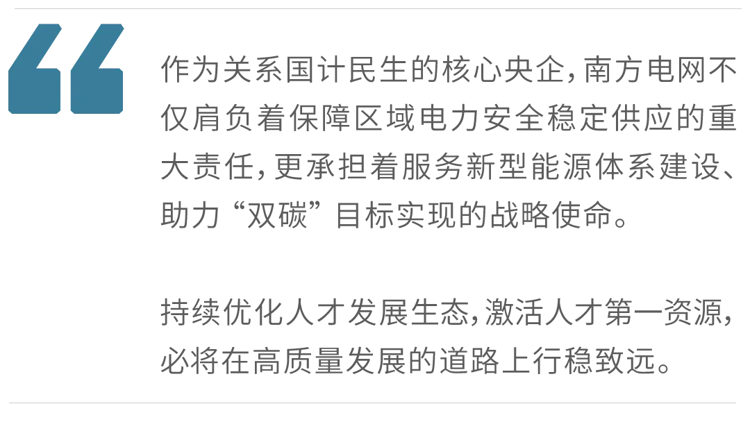 面向未来,随着人才强企战略的纵深推进,高水平人才队伍将进一步支撑新型电力系统建设,助力粤港澳大湾区电力人才共育、服务西部能源基地发展,在保障电力供应、推动能源转型、促进区域协调发展等方面发挥更大作用。