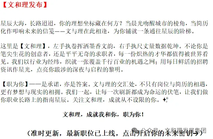 本公众号提供的所有招聘内容都来自网络,文字以及图片版权归原作者所有,仅供参考与交流,将不负责由此引起的任何法律等问题!如有涉及侵权的情况,敬请版权相关权利人随时与我们联系,我们将及时纠正删除,谢谢!