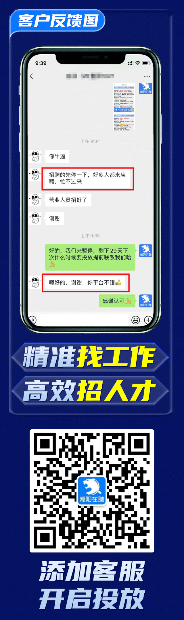 职位要求:1. 通过电话的方式为客户推荐并在线办理相关移动业务(如流量包、套餐、宽带办理、续费等)2. 根据客户实际情况推荐适合移动业务/套餐/宽带服务 3.有销售经验者优先,无经验可带,需会说潮汕话