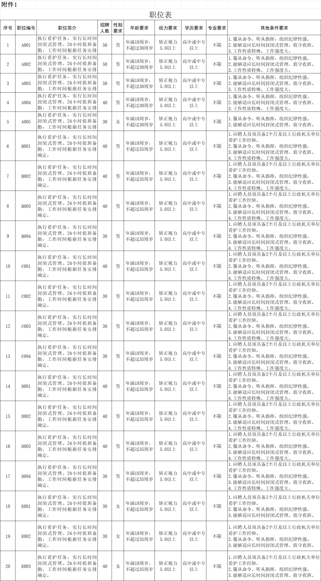 本次招聘人员为履行《广东省公安机关警务辅助人员管理办法》规定的辅助性警务职责的人员,不具有人民警察、公务员或事业编制人员身份,不属于依据《深圳经济特区警务辅助人员条例》管理的人员。聘用人员将与第三方劳务派遣公司签订劳动合同,工作时间根据任务安排确定,需长期封闭式管理、值守夜班,工作强度大。具体招聘职位、人数等详见《职位表》(附件1)。