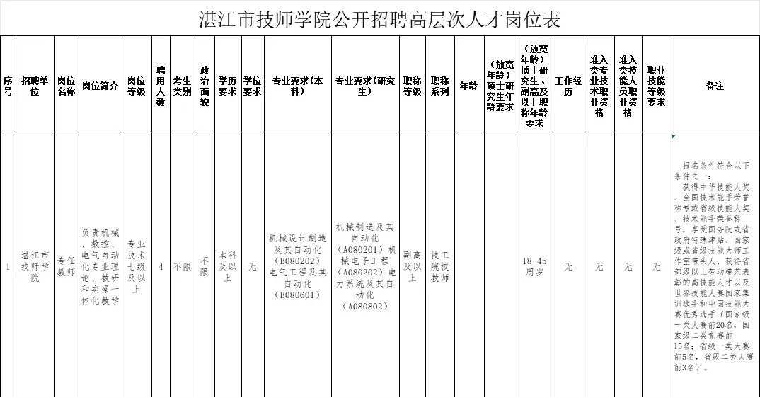 本次拟公开招聘教师4名。招聘岗位、招聘名额、招聘条件、专业要求等详见《湛江市技师学院公开招聘高层次人才岗位表》(附件1)。