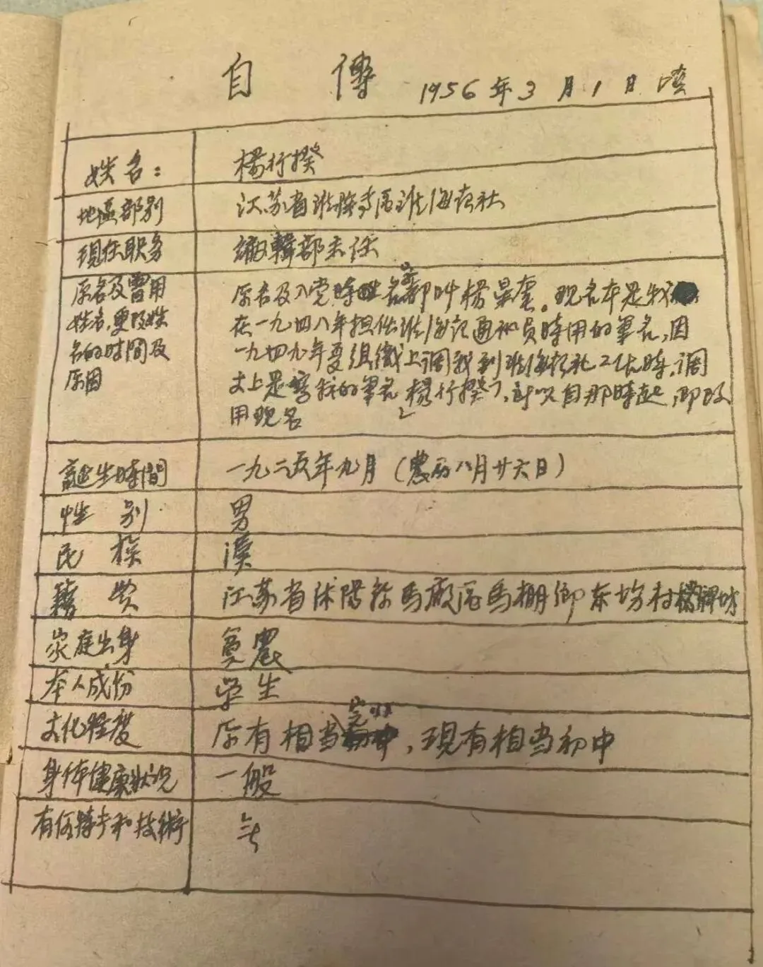杨牌坊私塾的教育功能如此的伟大,它使多少老杨家的人,怀揣理想,远离故土,抱着誓死不做亡国奴、救民于水火的情怀,舍生取义,在动荡岁月,的确需要大视野、大智慧,而扛枪打仗的族中叔叔们,仅在自传中简单提及儿时的点点滴滴教育情况,我们通过父亲的口述、杨氏族谱的记载和到父亲1956年3月1日(我们还没出生)写的自传中找寻,终于找到了关于老家杨牌坊私塾的记载。