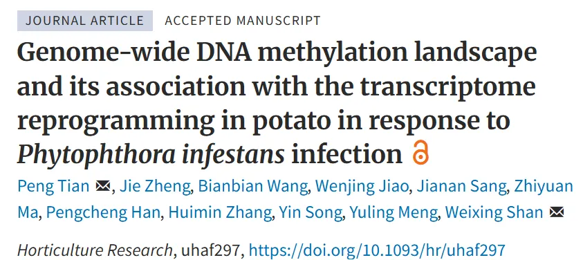 近日,西北农林科技大学农学院单卫星教授团队在《Horticulture Research》在线发表了一项重要研究成果,题为“Genome-wide DNA methylation landscape and its association with the transcriptome reprogramming in potato in response to Phytophthora infestans infection”。该研究系统揭示了马铃薯在遭遇致病疫霉(Phytophthora infestans)侵染早期阶段全基因组DNA甲基化的动态变化特征,并深入探讨了这些表观遗传修饰与转录组重编程之间的内在联系。