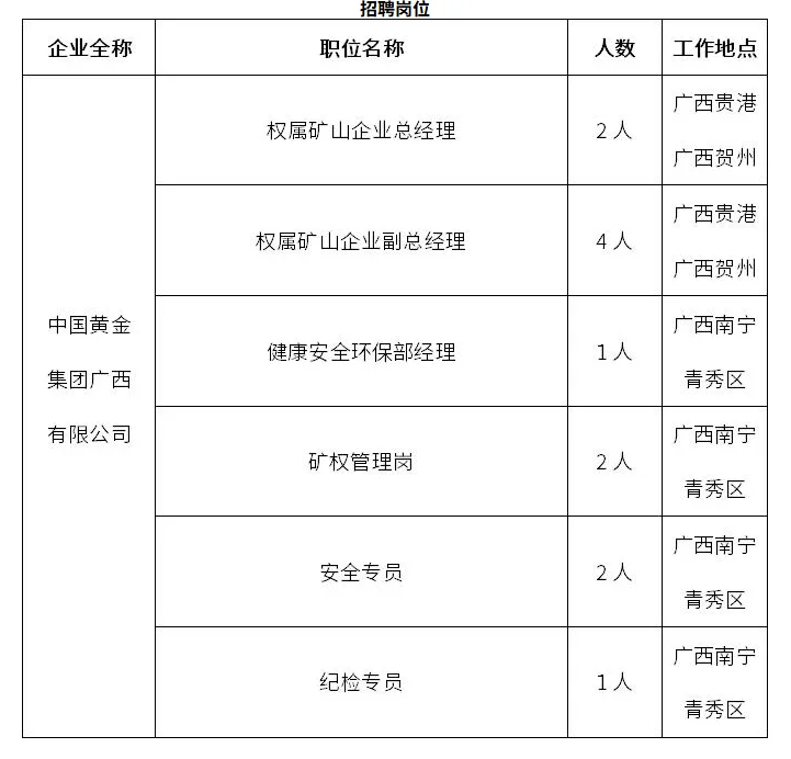 根据发展规划与高质量发展需要,中国黄金集团广西有限公司发布招聘公告,面向社会招聘一批业务骨干人员,公告如下。