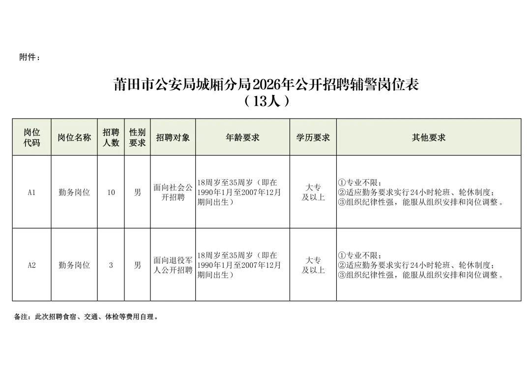莆田市公安局城厢分局辅警13名,具体职位、人数、条件等见《莆田市公安局城厢分局2026年公开招聘辅警岗位表》。
