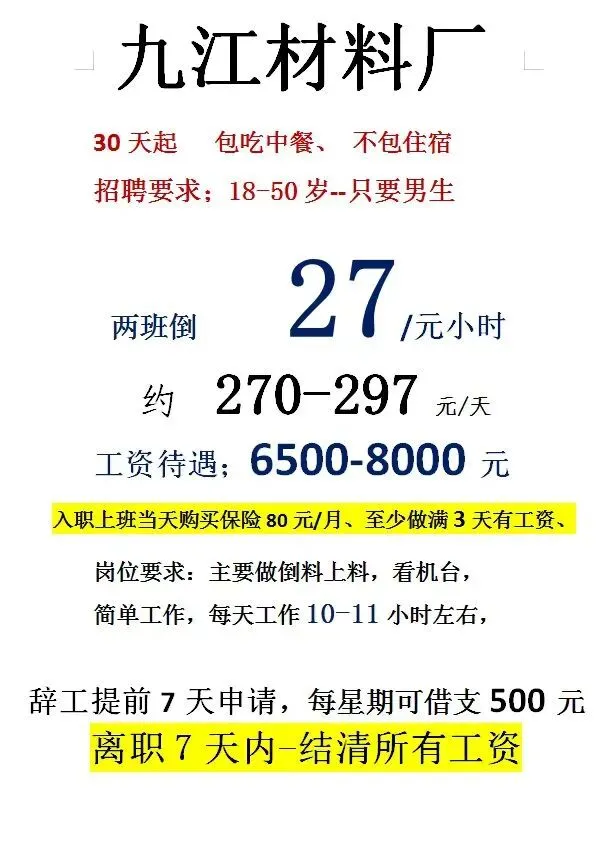 要求:男工20-50岁,能适应两班倒