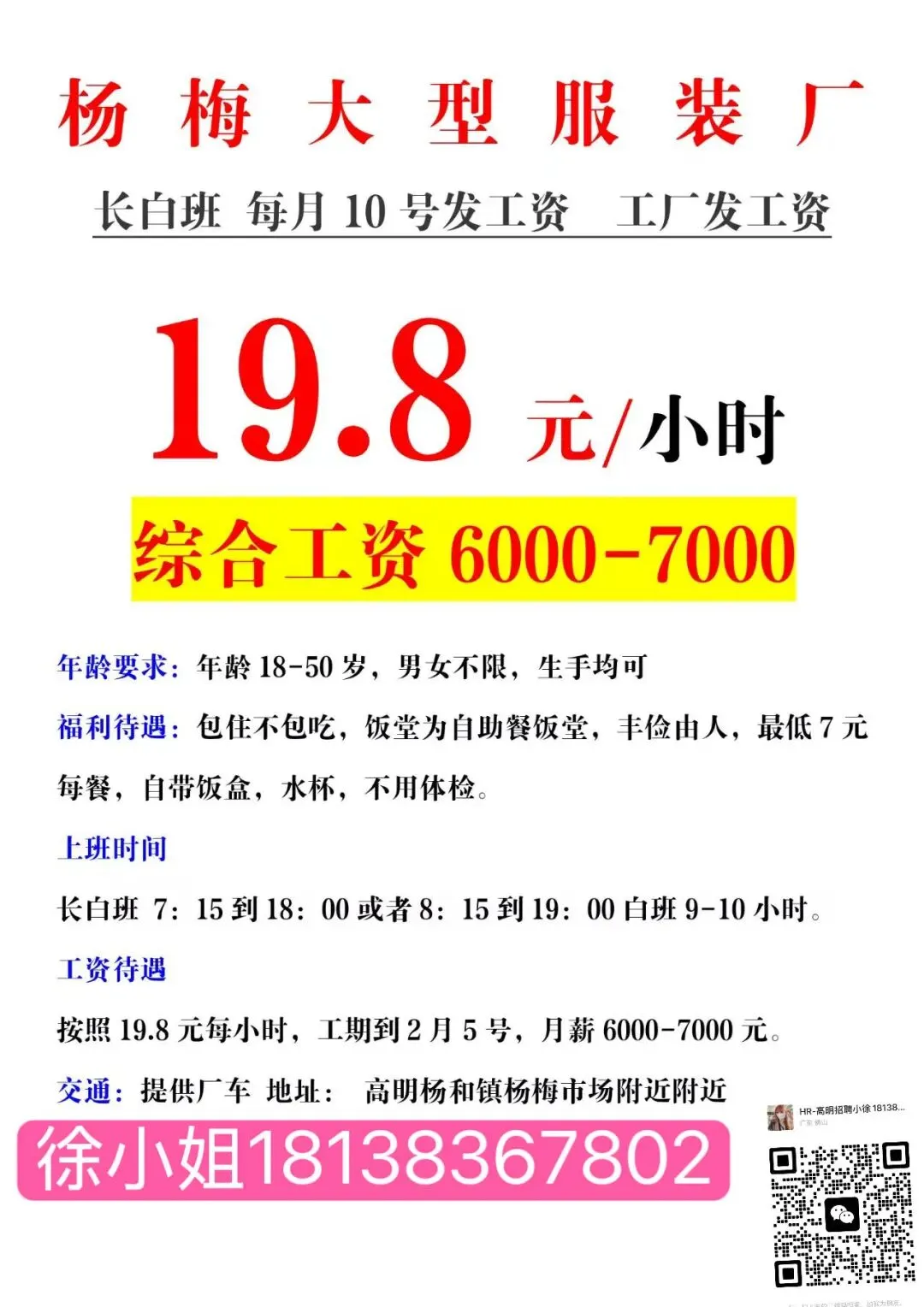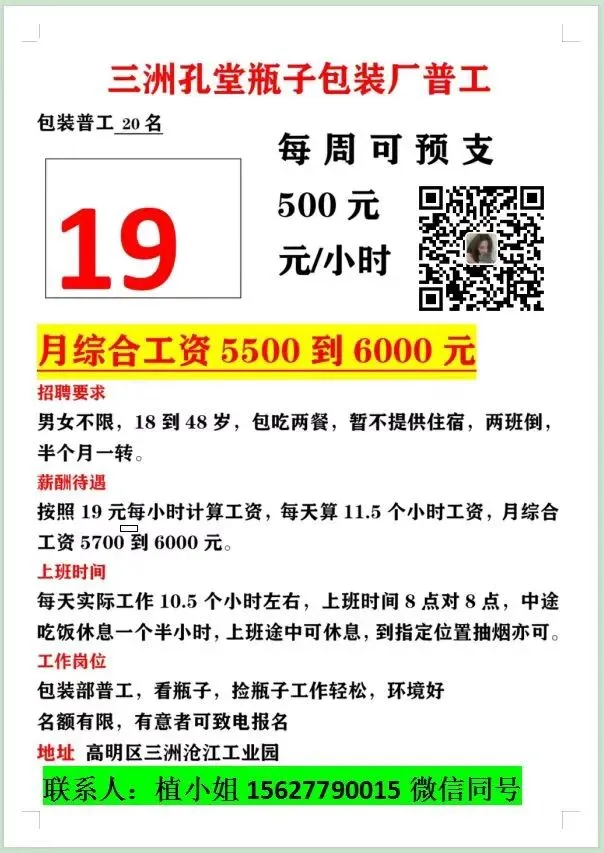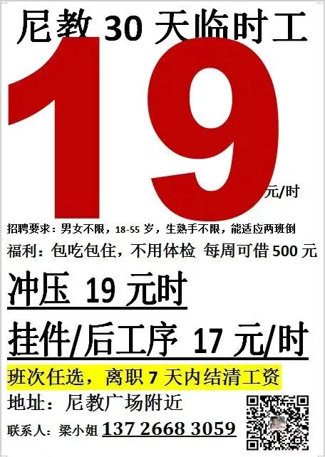 薪资待遇:19元/小时,长白班