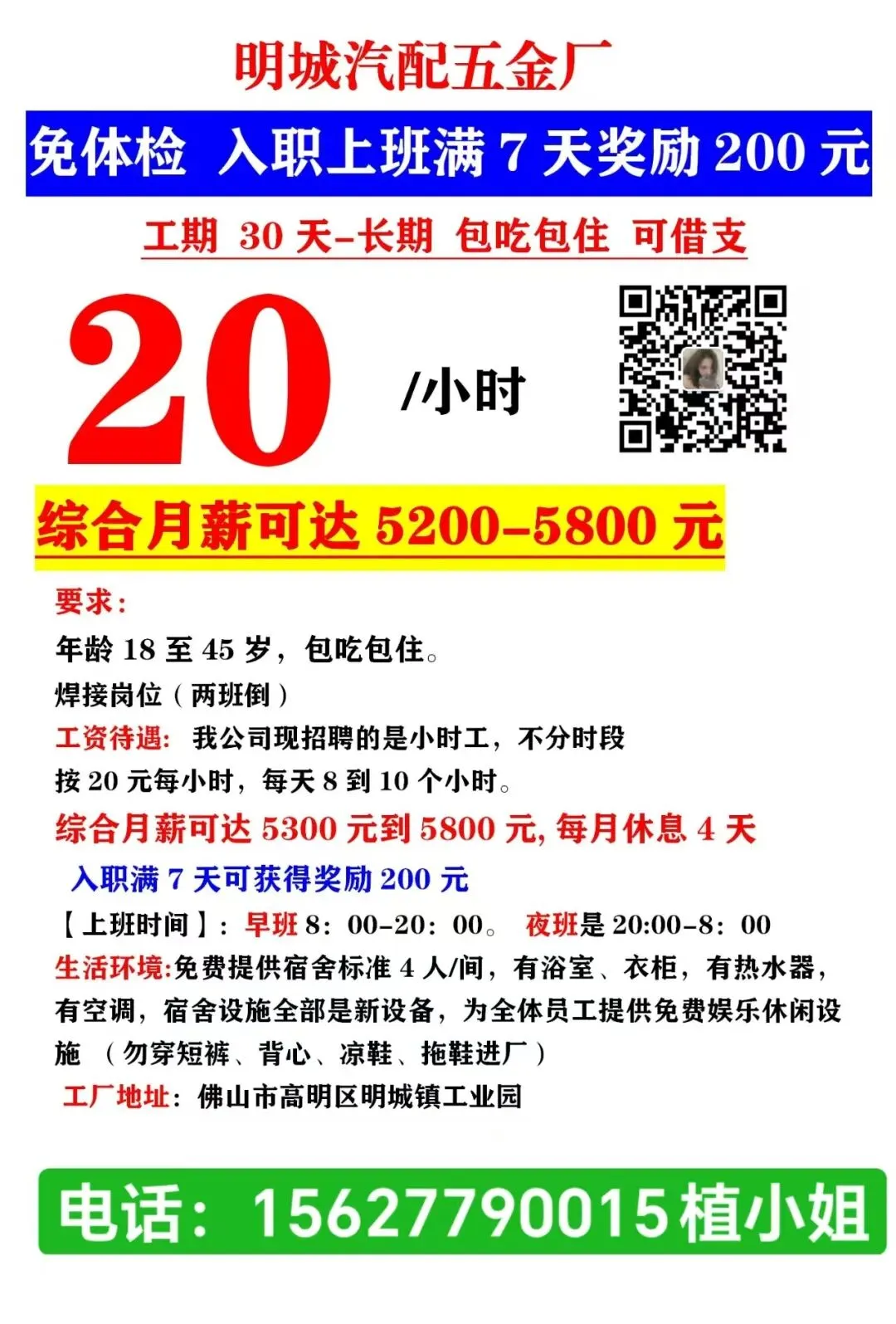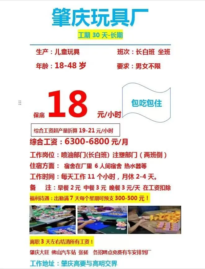 福利:包吃住(宿舍4人间,空调热水器),免体检,入职7天可借支300-500元