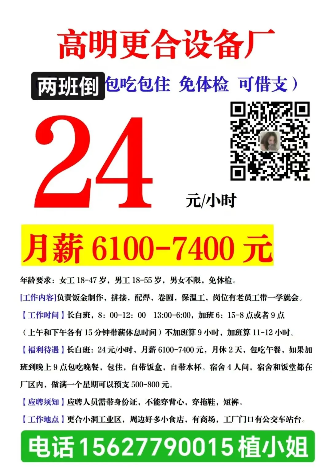 福利:包吃住(公寓6人间,空调热水器齐全,水电平摊),免体检、可借支