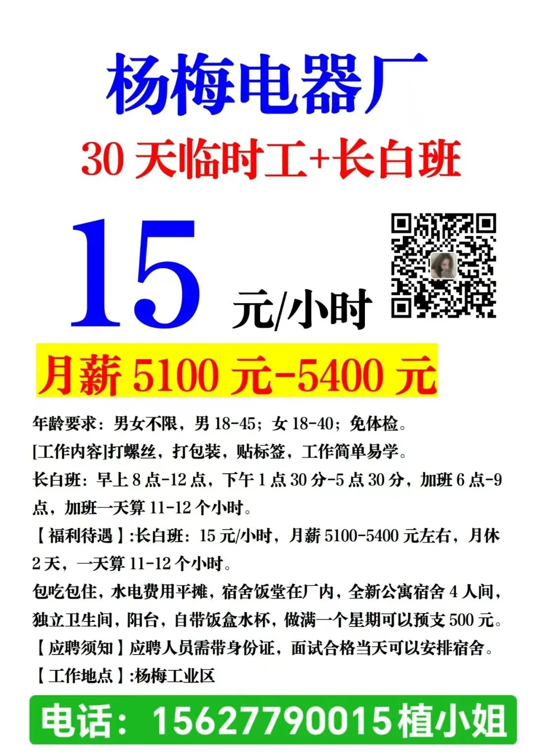 福利:包吃住(水电平摊),白班餐补30元/天,夜班餐补15元/天