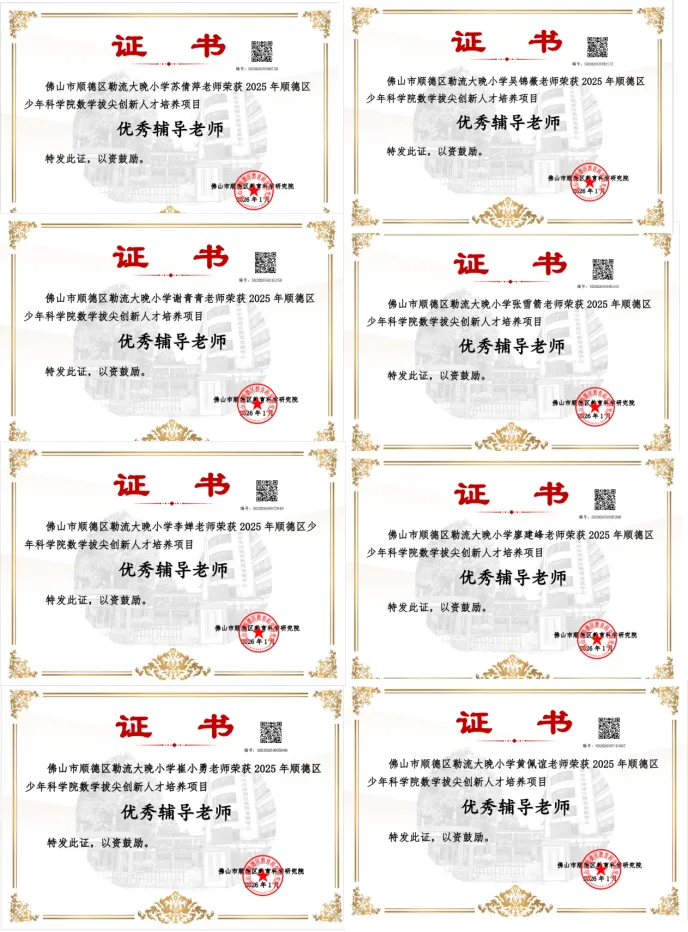 新年伊始,喜讯传来。在2025年顺德区数学核心素养竞赛中,大晚小学以优异的表现荣获顺德区数学拔尖创新人才培养“优秀学校奖”,连续两年在该项目中荣获重要奖项。同时,学校共有8位教师荣获“优秀指导教师”称号。这一双重荣誉,这是对大晚小学在拔尖创新人才培养方面的高度肯定。