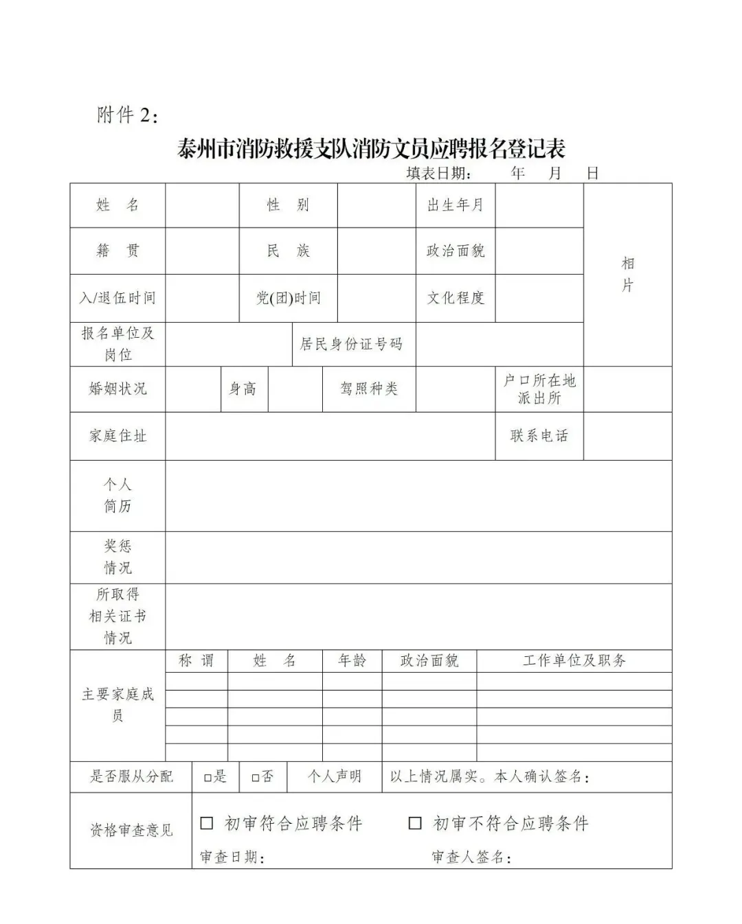 1)《泰州市消防救援支队消防文员应聘报名登记表》(附件2);