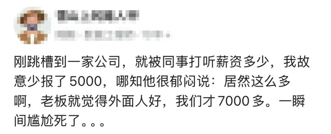 刚跳槽到一家公司,就被同事打听薪资多少,我故意少报了 5000,哪知他说:居然这么多啊,老板就觉得外面人好,我们才7000多.